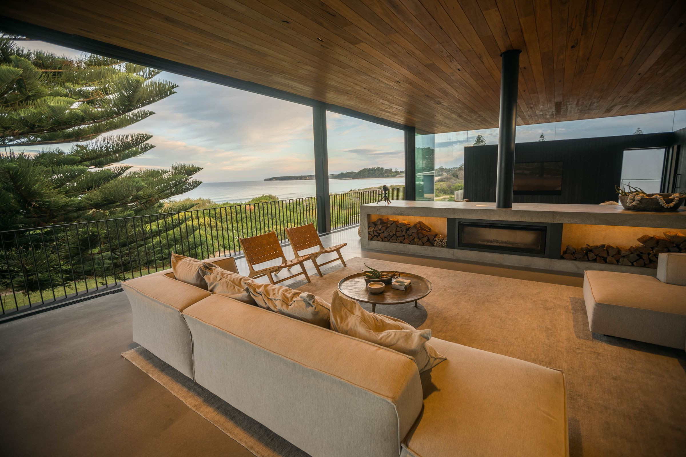 To take advantage of the water views beyond, the architects inverted a traditional room arrangement to put bedrooms at ground level and the open-plan kitchen, dining and living areas on the first floor. There’s a continuous 24-metre length of glazing on the first floor, with all glass windows sliding into an accordion fold in one position. “When you’re in the kitchen or in the living areas, you feel like you are sitting on a covered deck,” Cashman says.