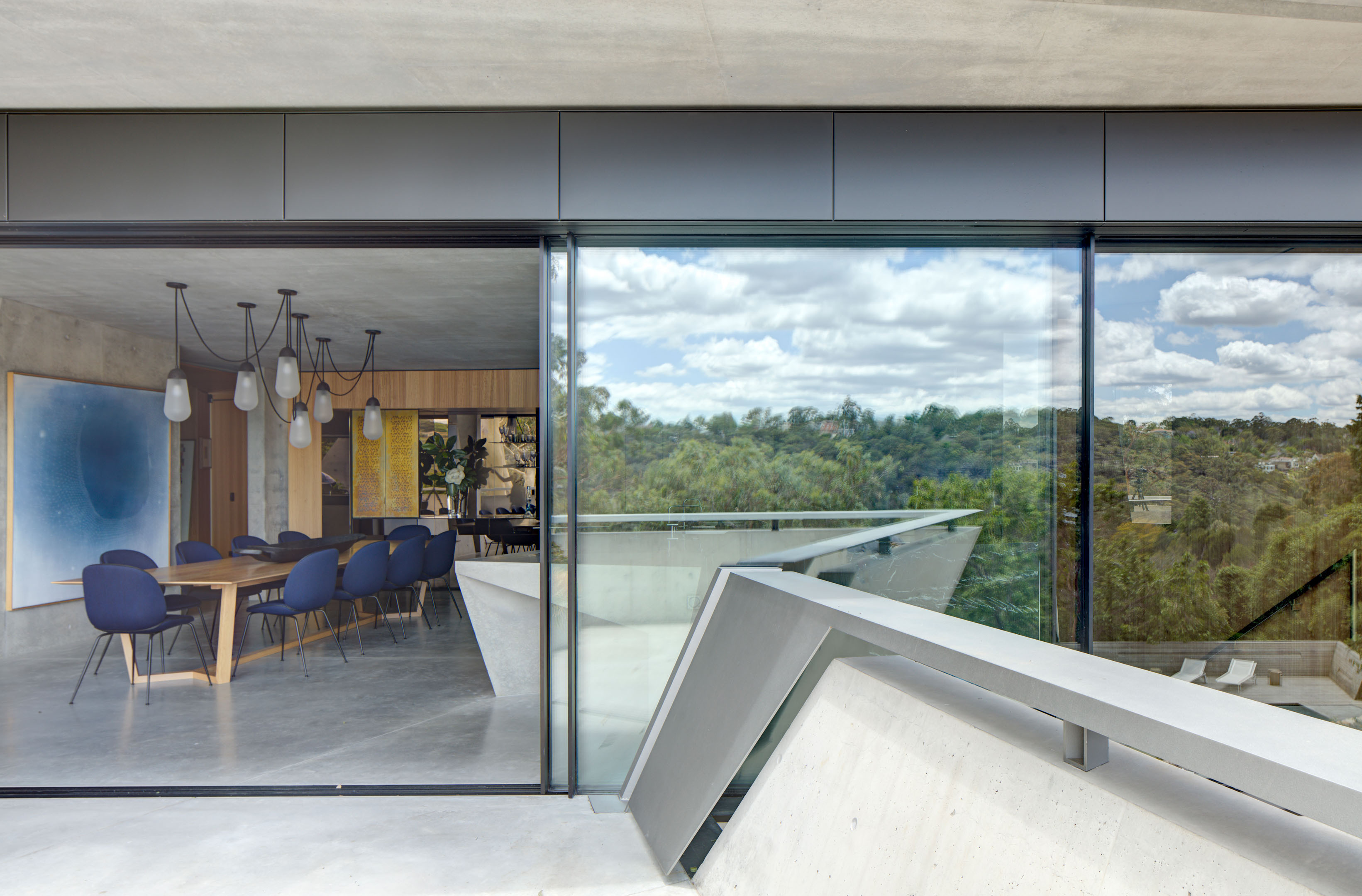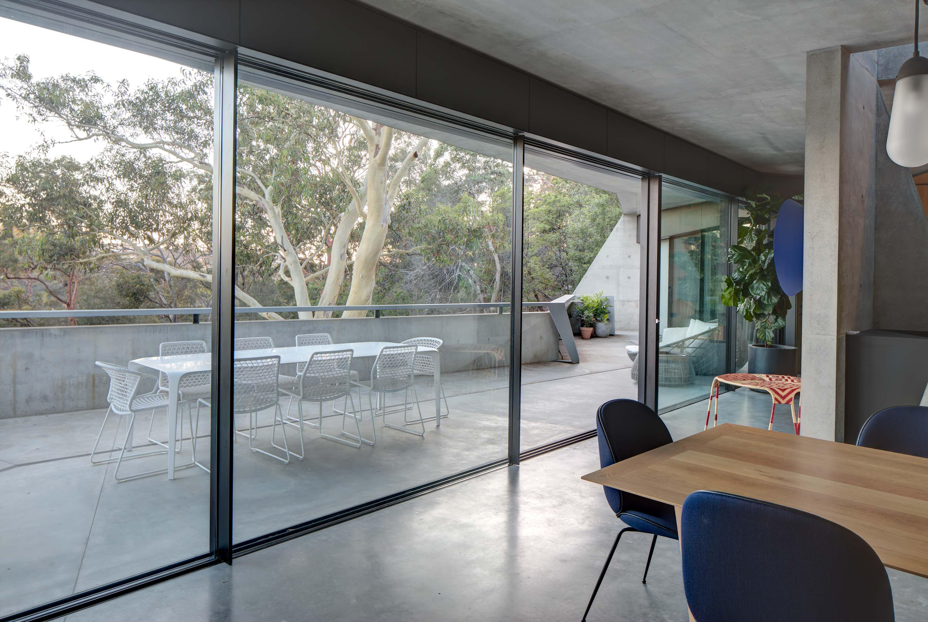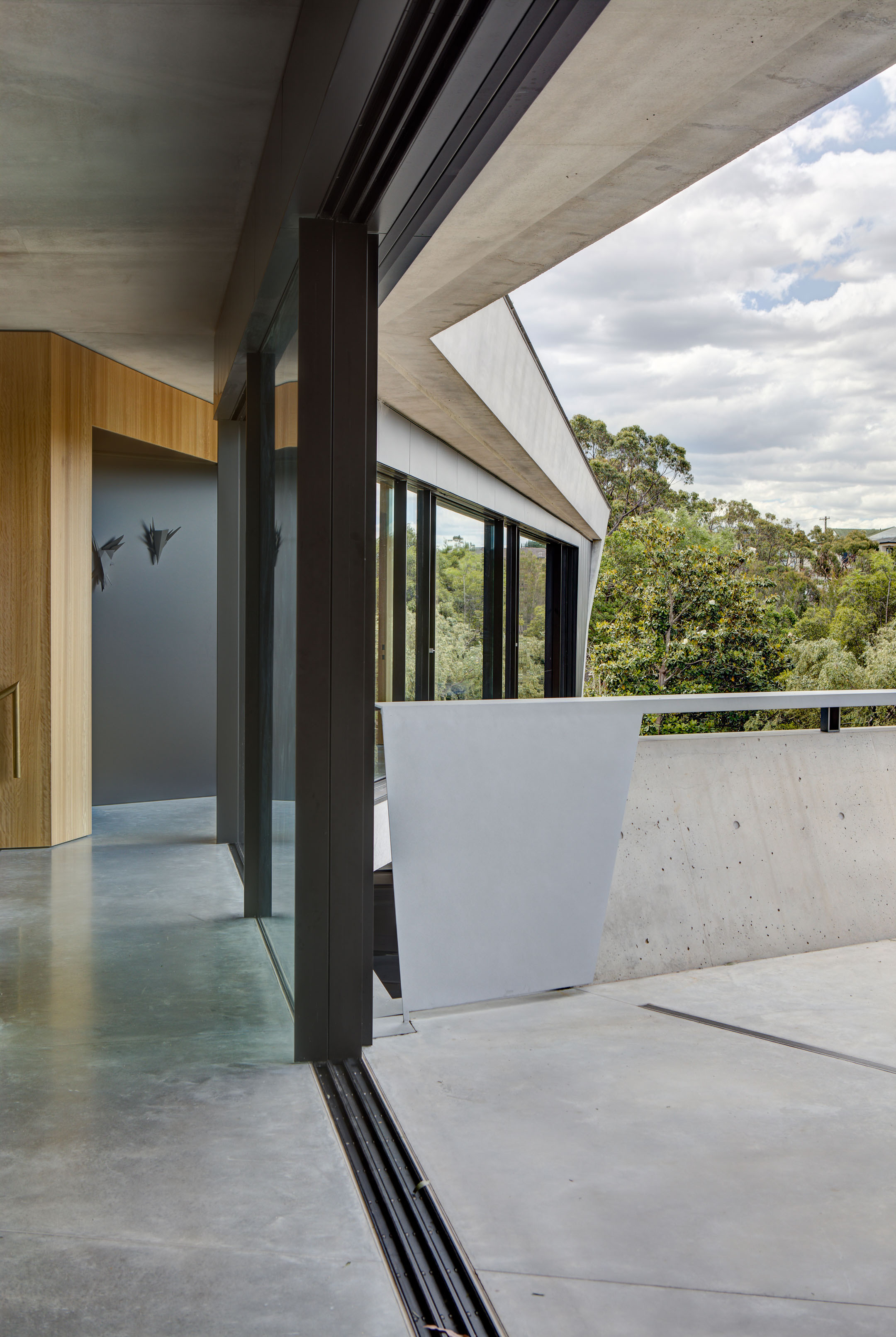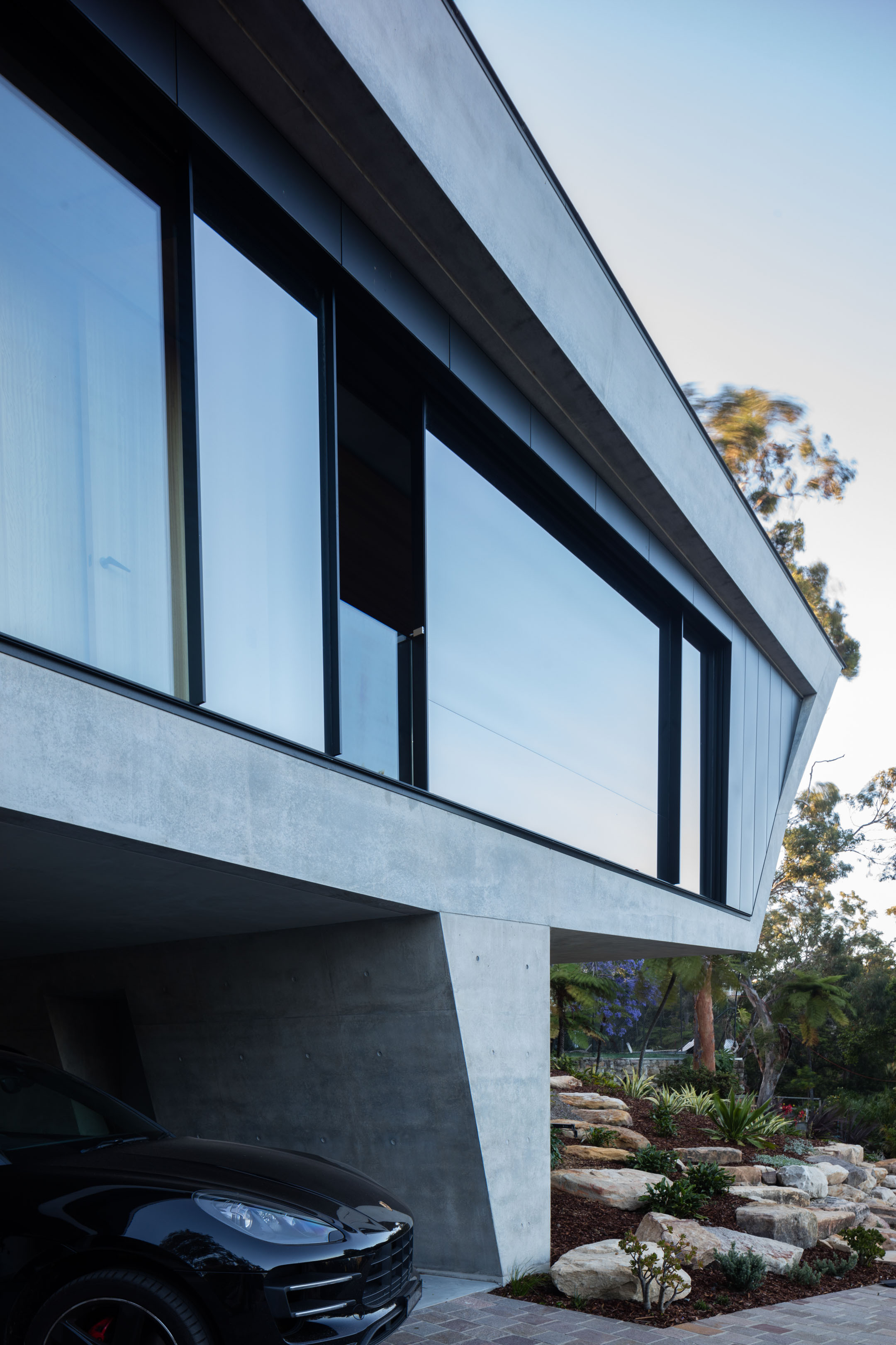 Constructed in concrete, with angular walls and windows, Castle Cove House is perched on a cliff face overlooking Middle Harbour. Vitrocsa Sliding doors, orientated to the north, allow a seamless transition between inside and out.
