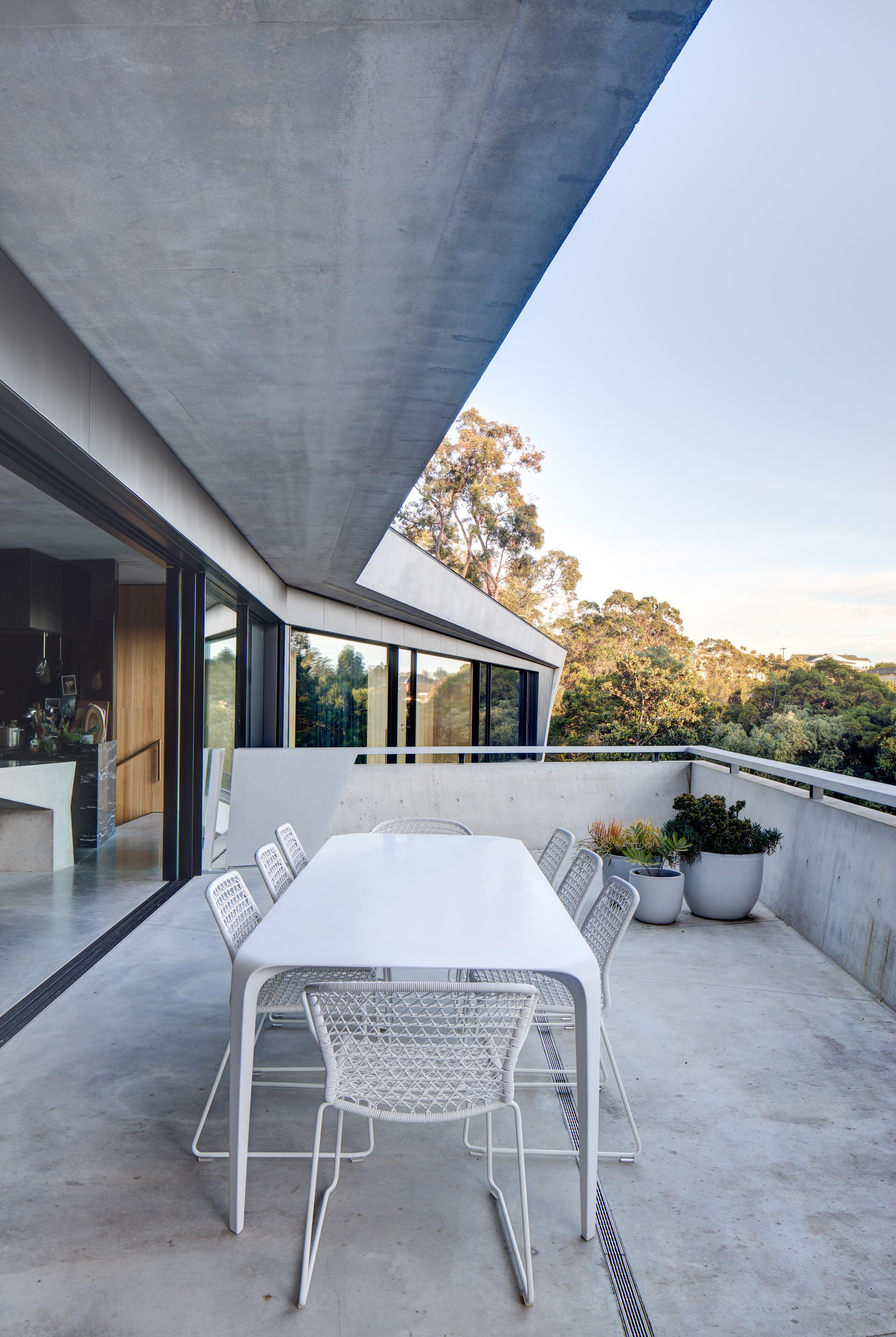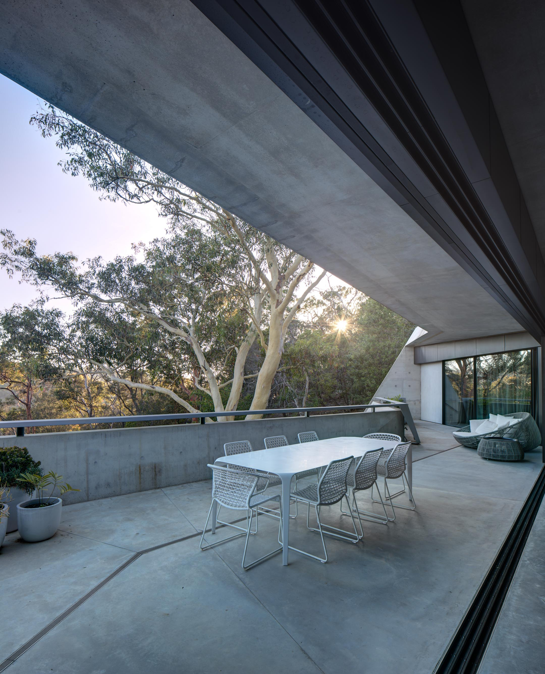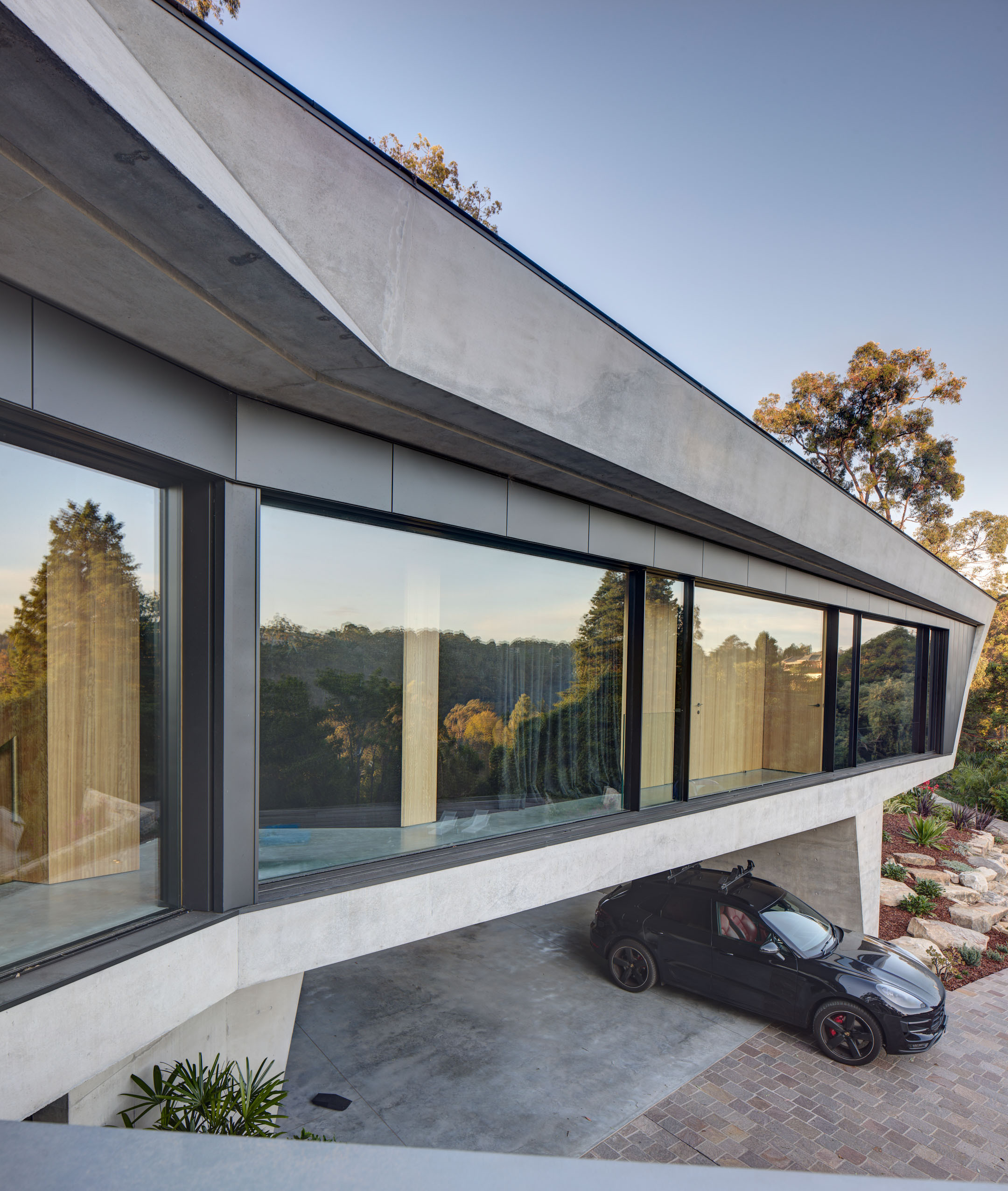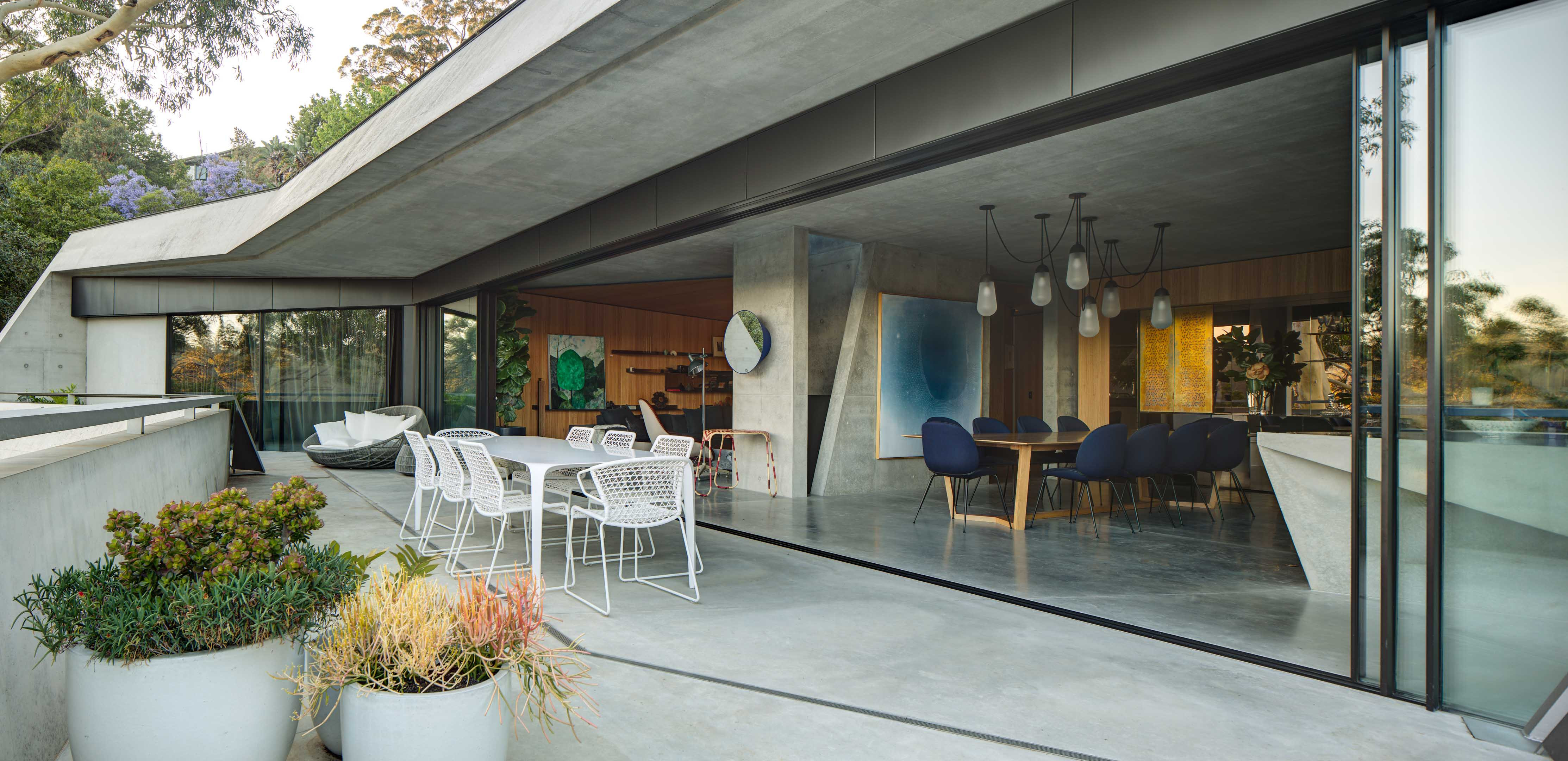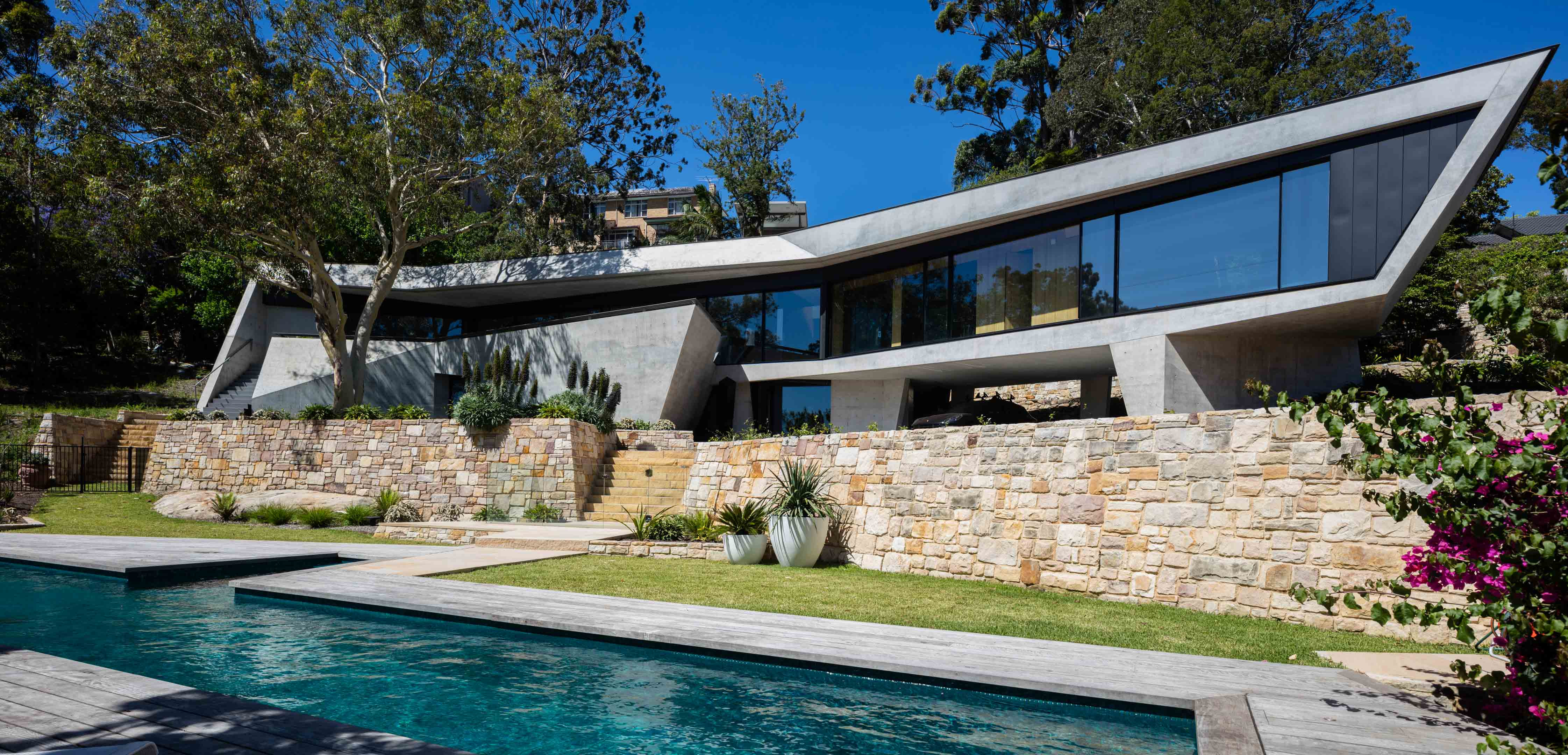 Constructed in concrete, with angular walls and windows, Castle Cove House is perched on a cliff face overlooking Middle Harbour. Vitrocsa Sliding doors, orientated to the north, allow a seamless transition between inside and out.