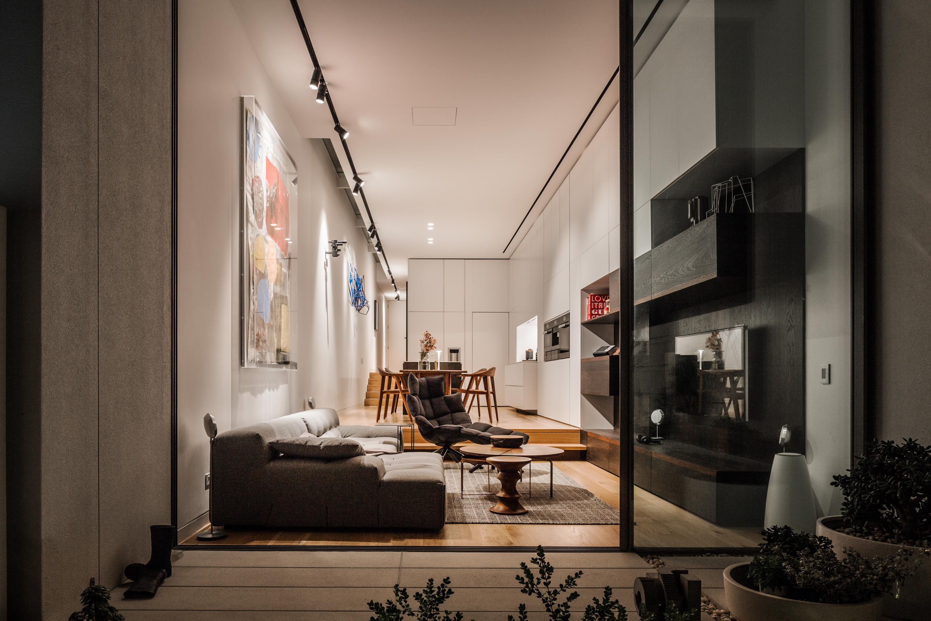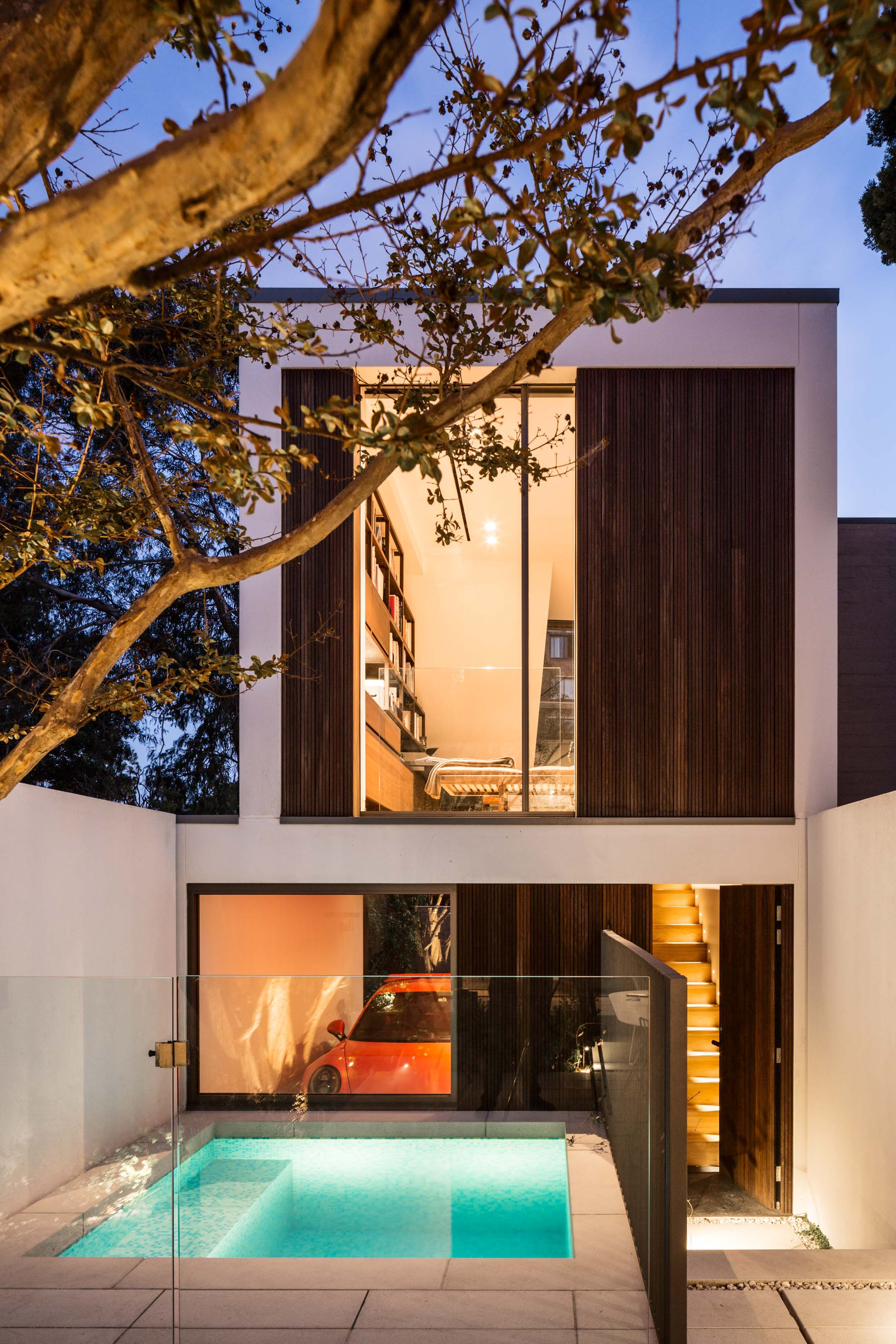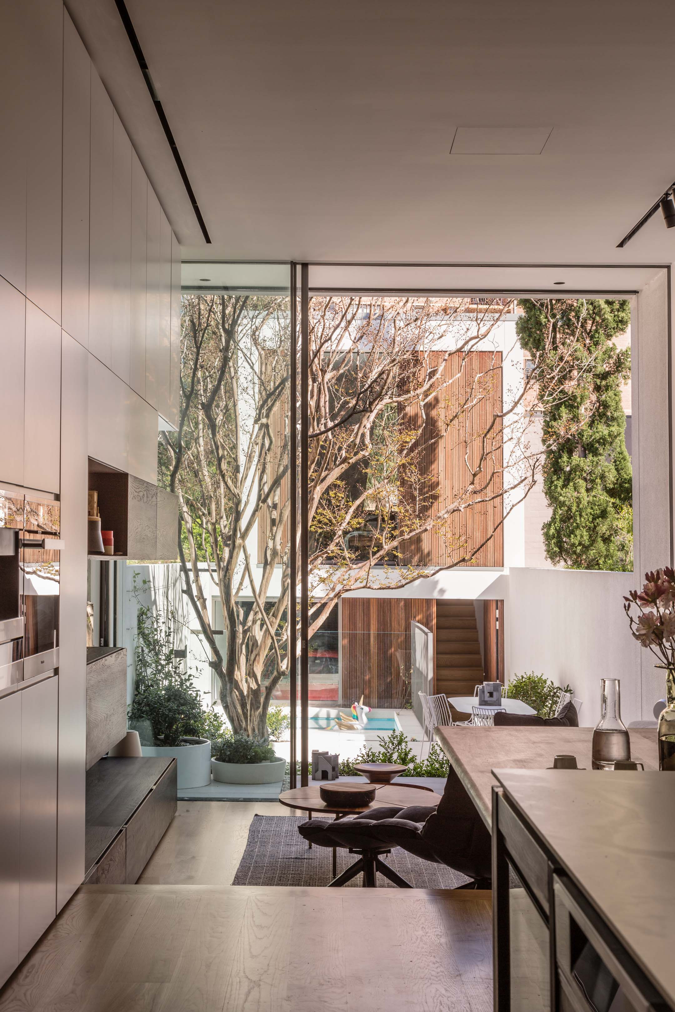 “Generous full-height Sliding glass doors create a seamless connection with the courtyard and plunge pool.”