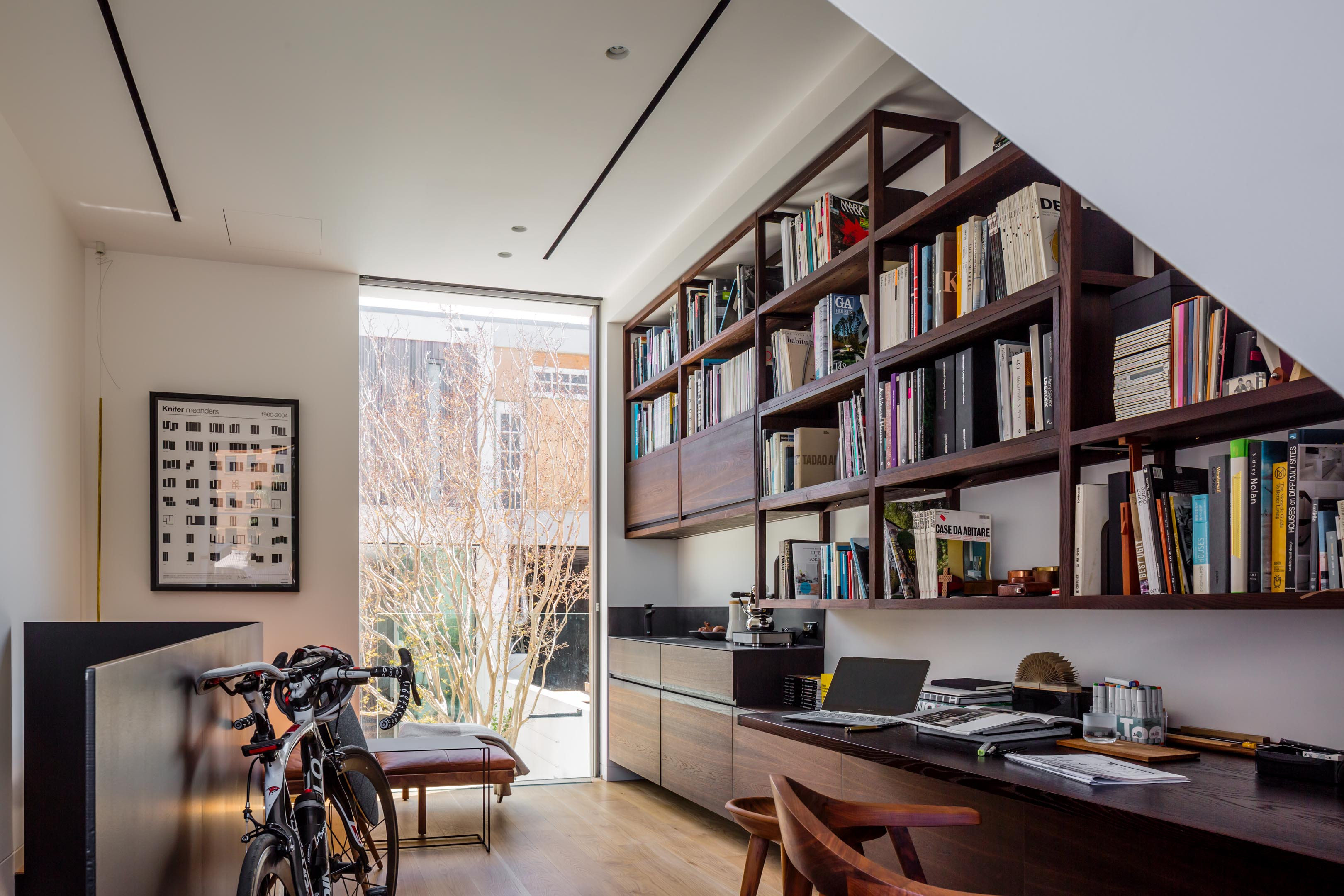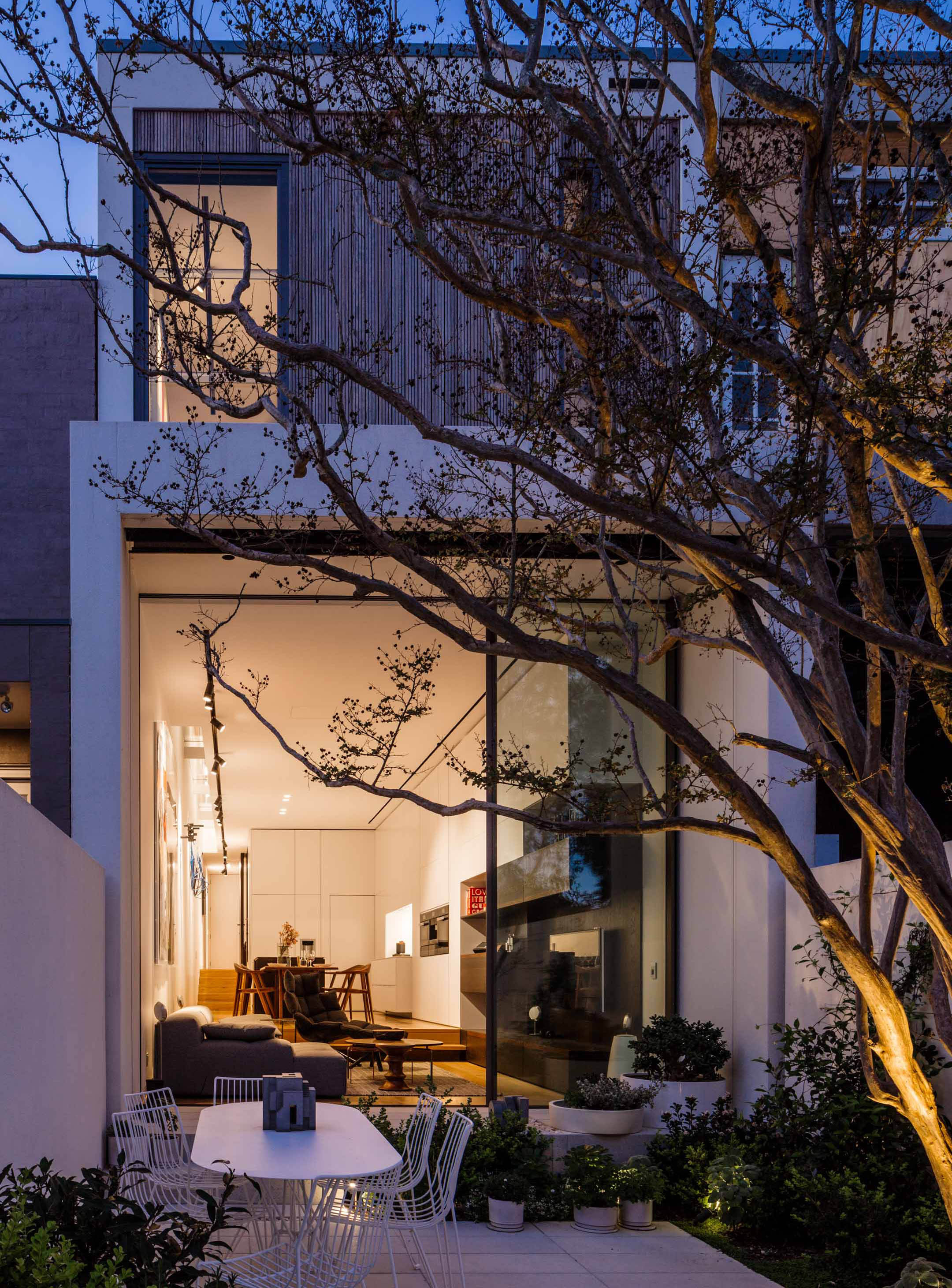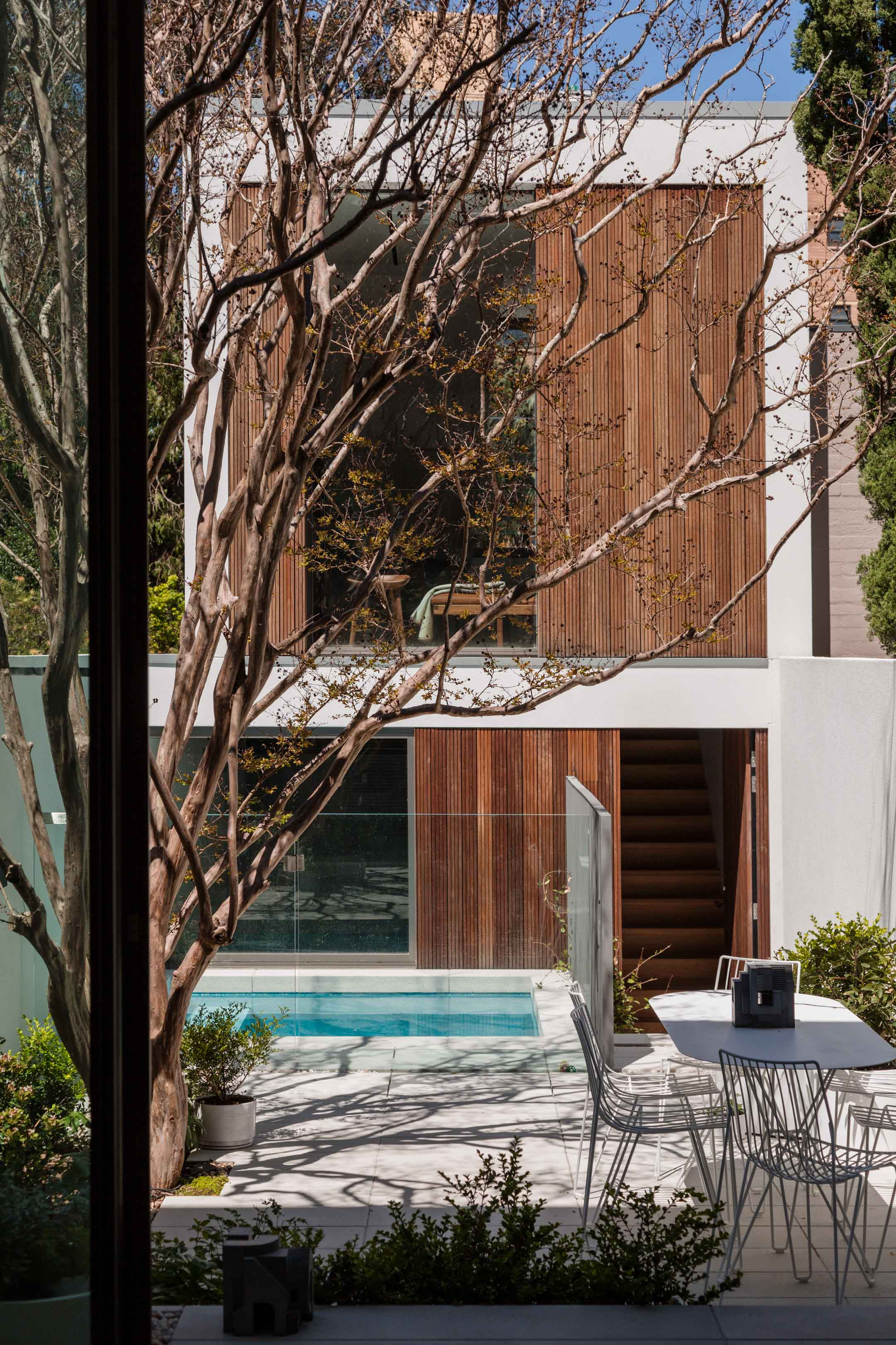 “Generous full-height Sliding glass doors create a seamless connection with the courtyard and plunge pool.”