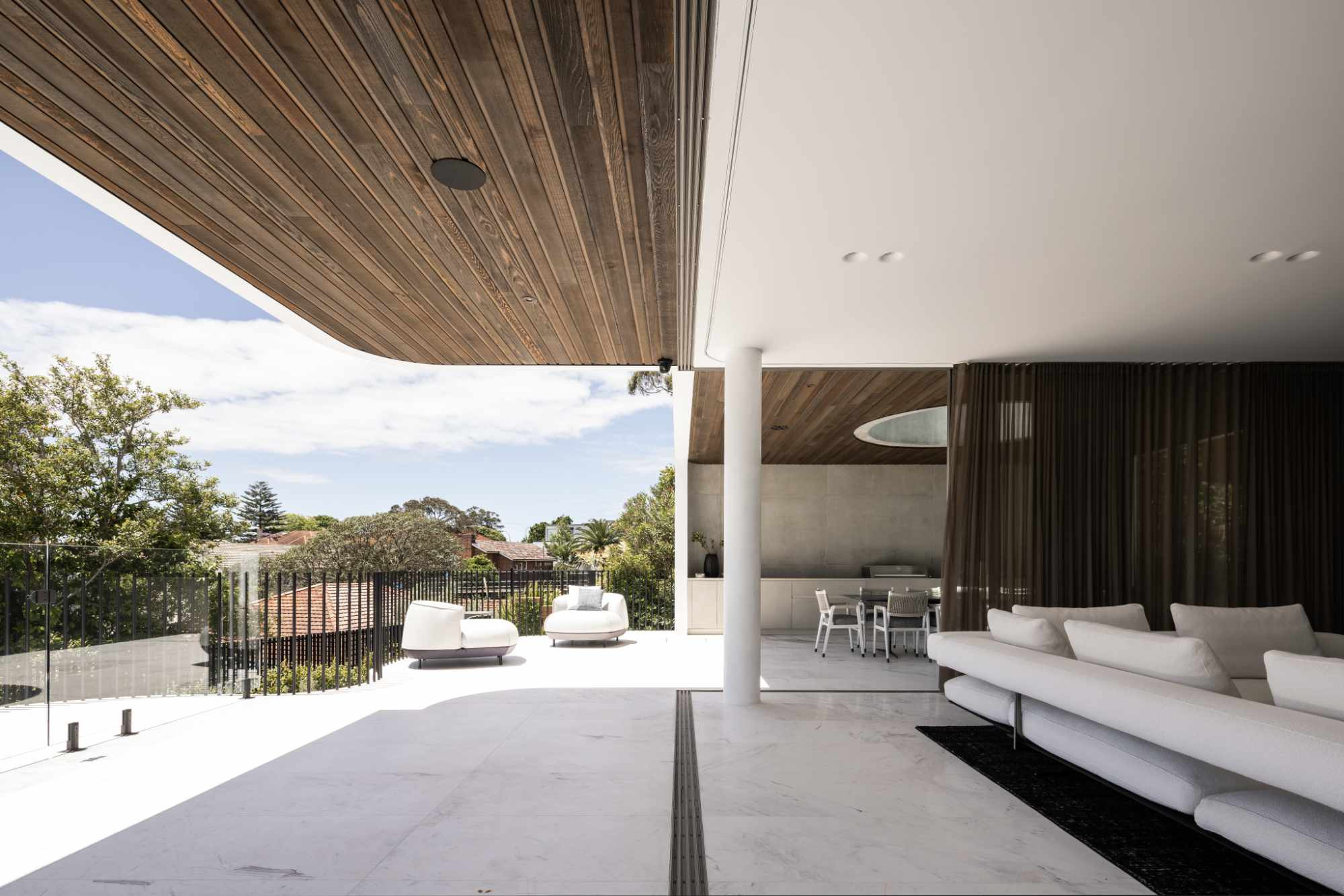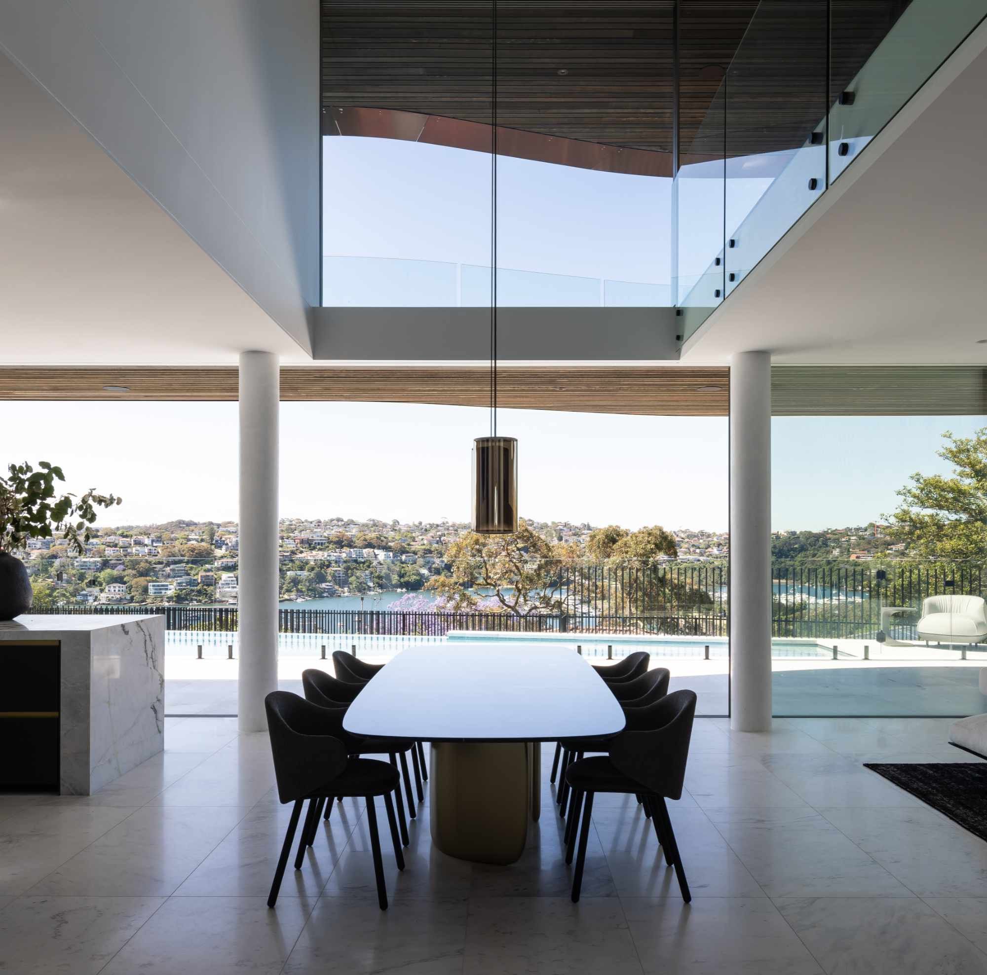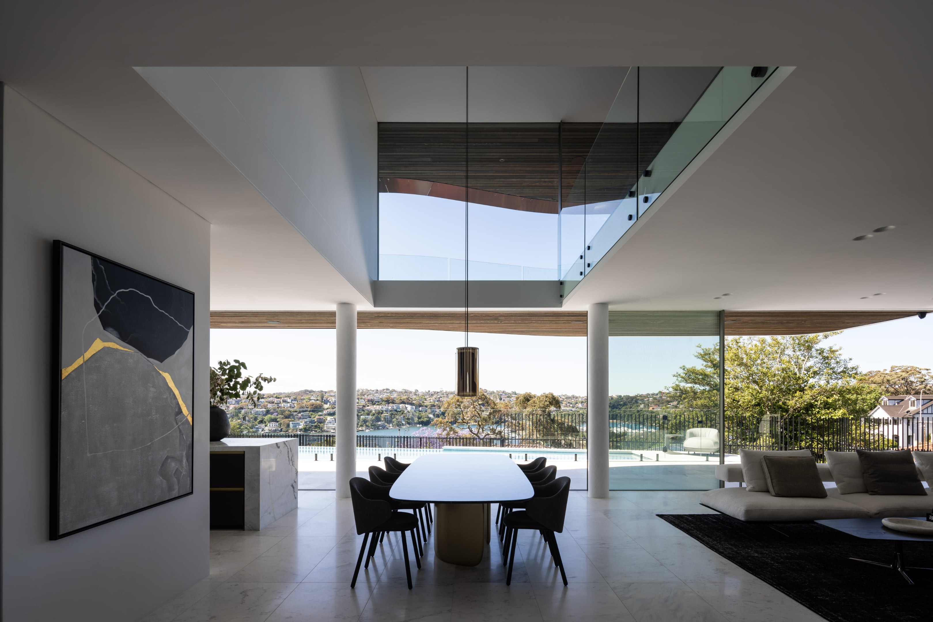 Doors slide away to open the living spaces to the entertaining area and water views.