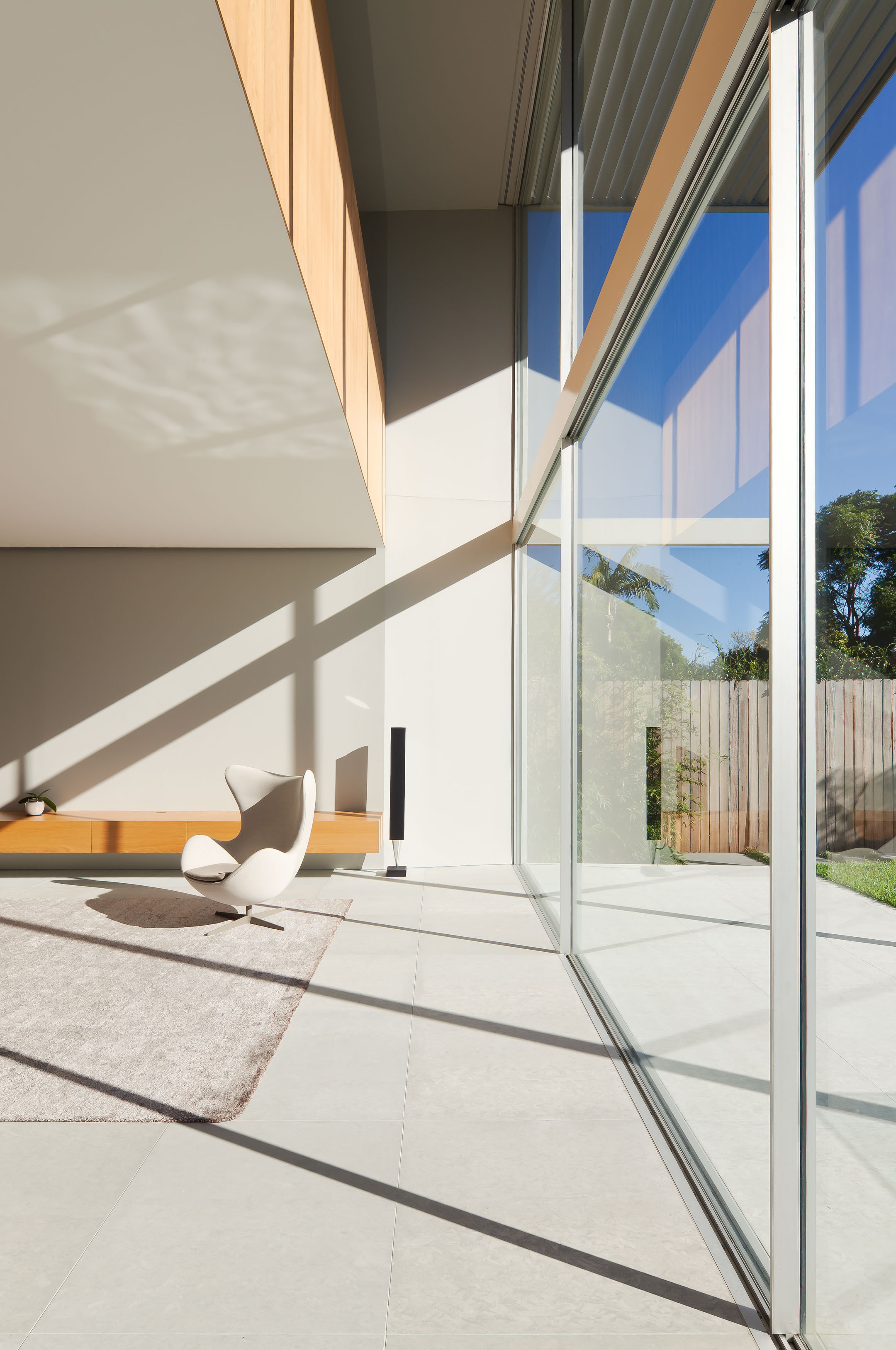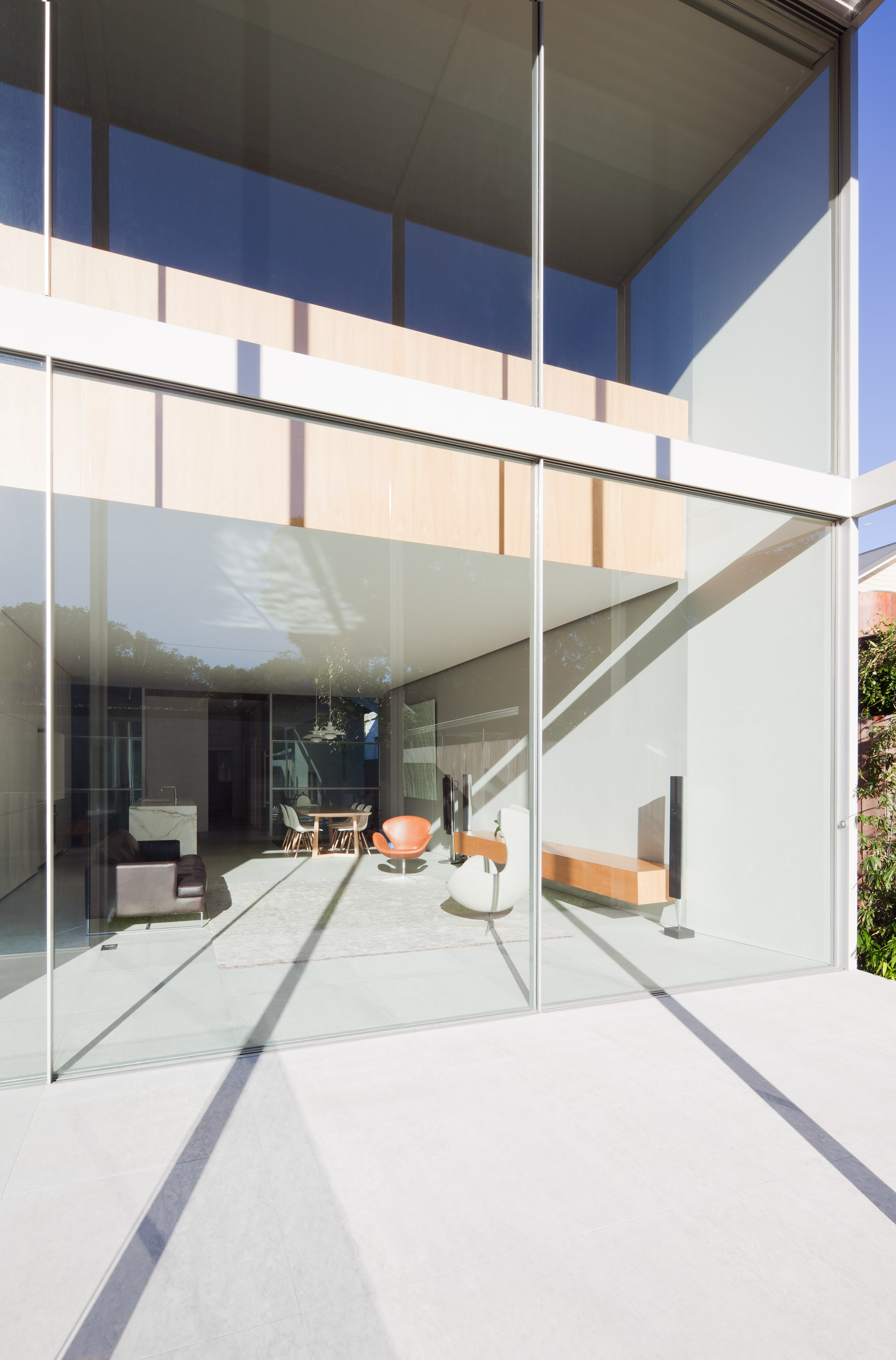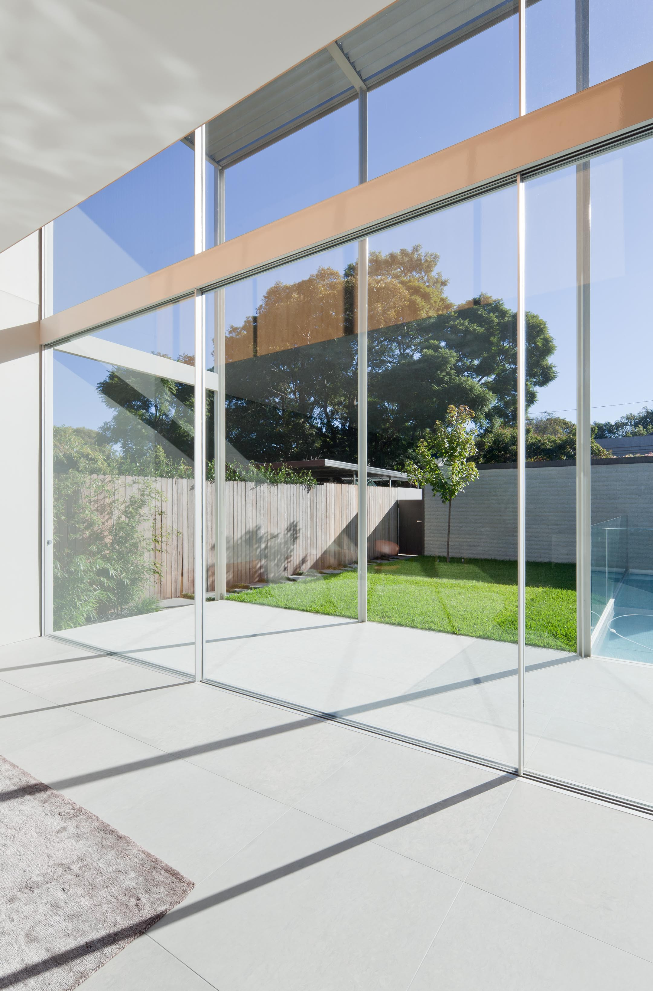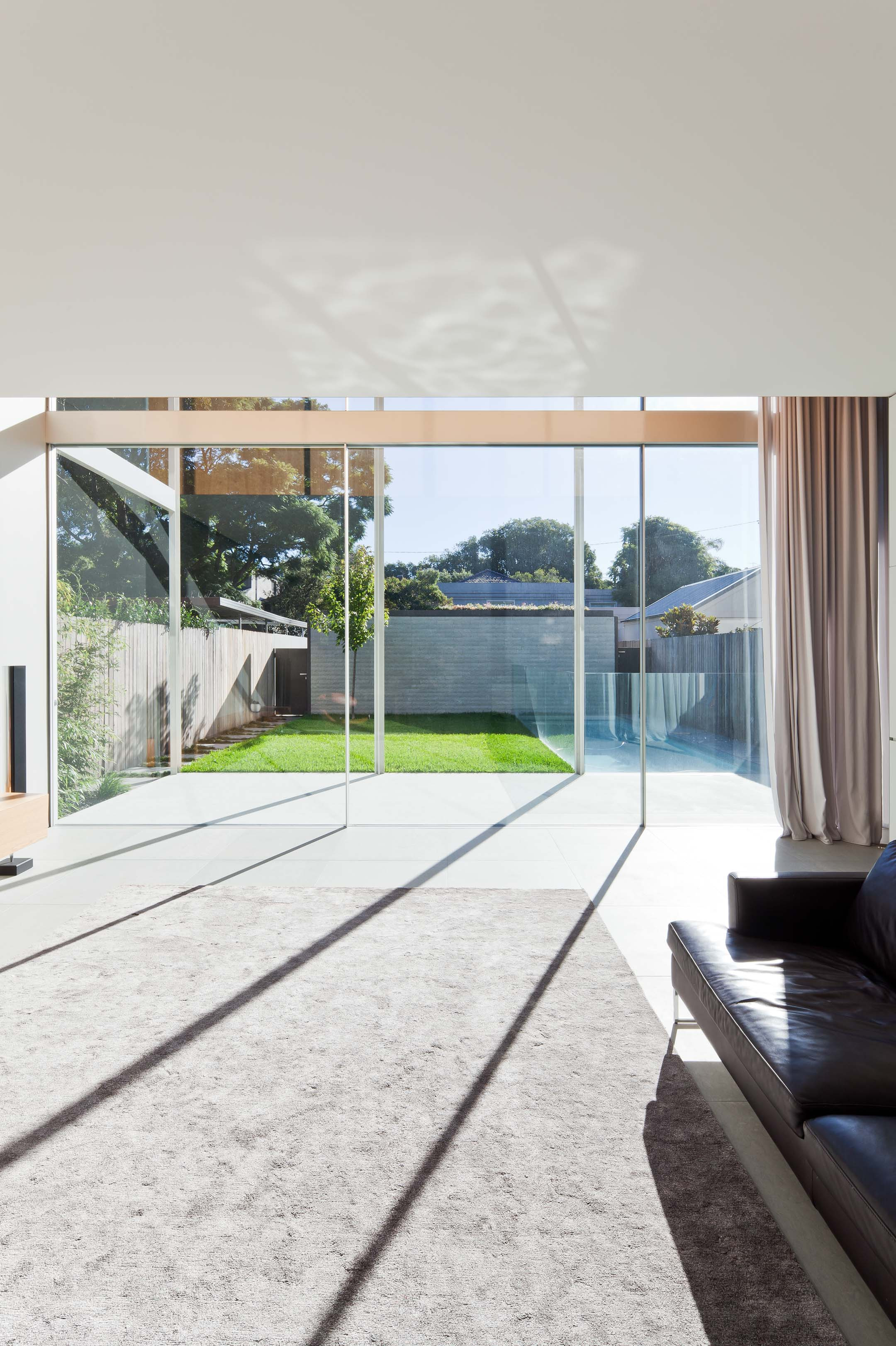 “East and west enclosing walls to the two-storey rear addition are fully glazed to maximise natural light and cross ventilation, and create a direct connection to the rear garden and pool. North and south enclosing walls remain solid for privacy to neighbouring properties, and taper on the ends to meet the finely detailed glazing system.”