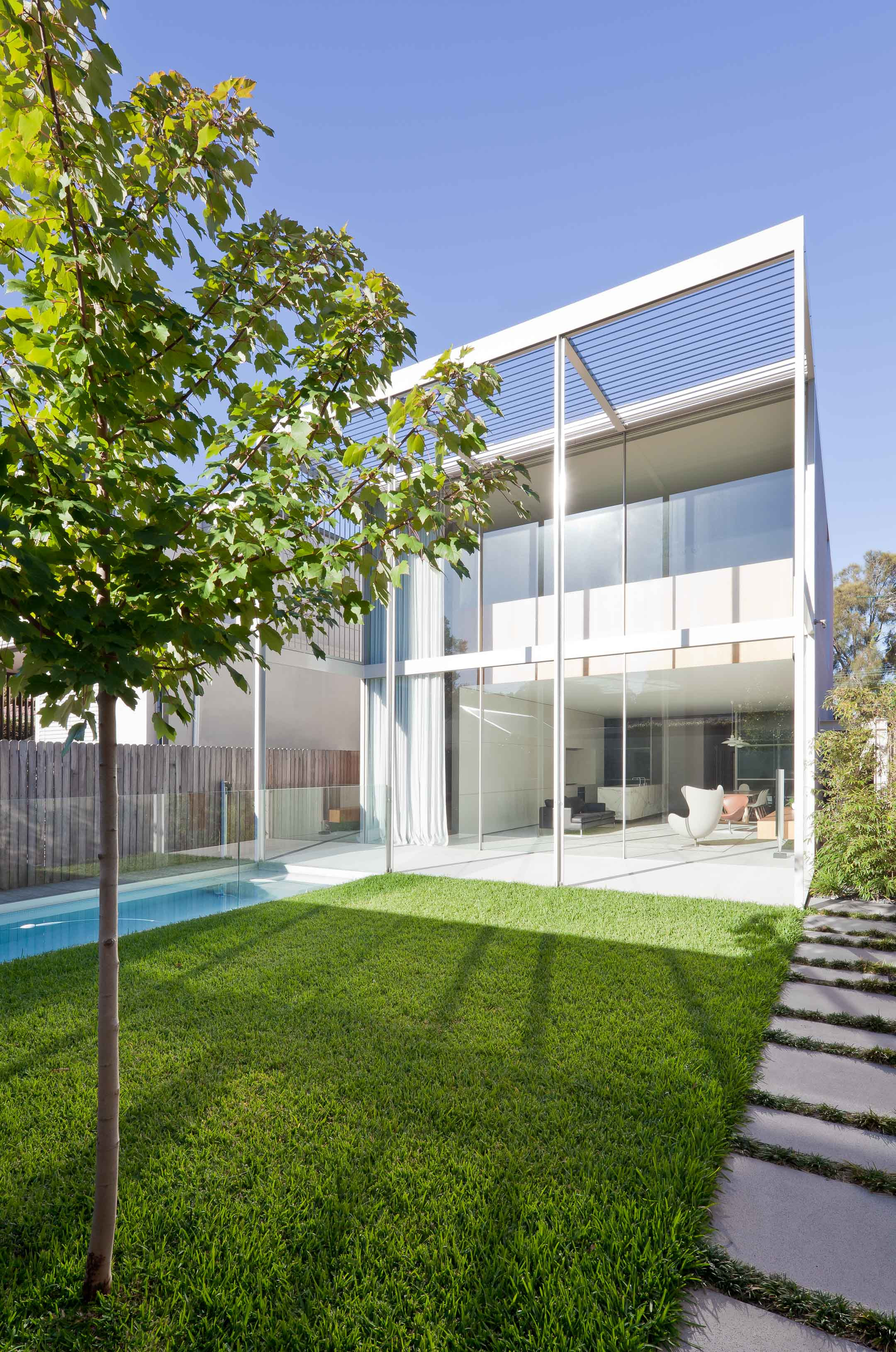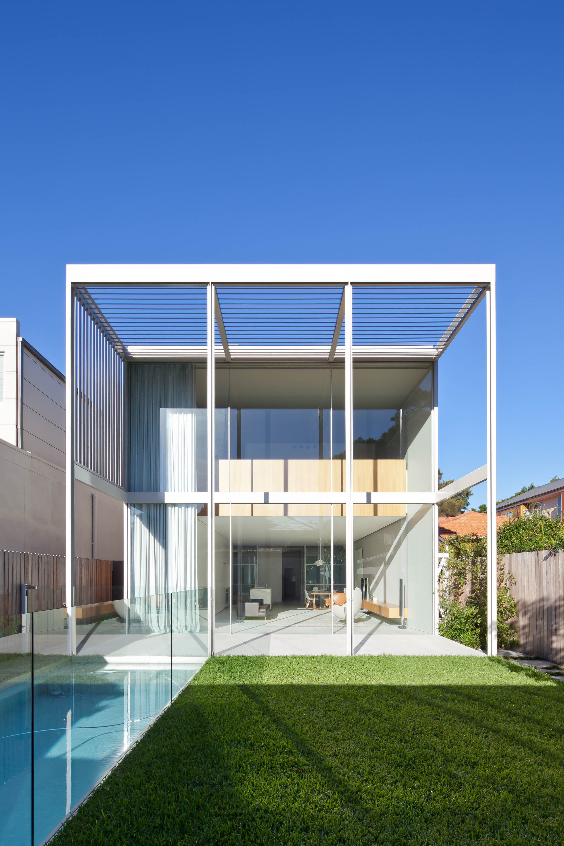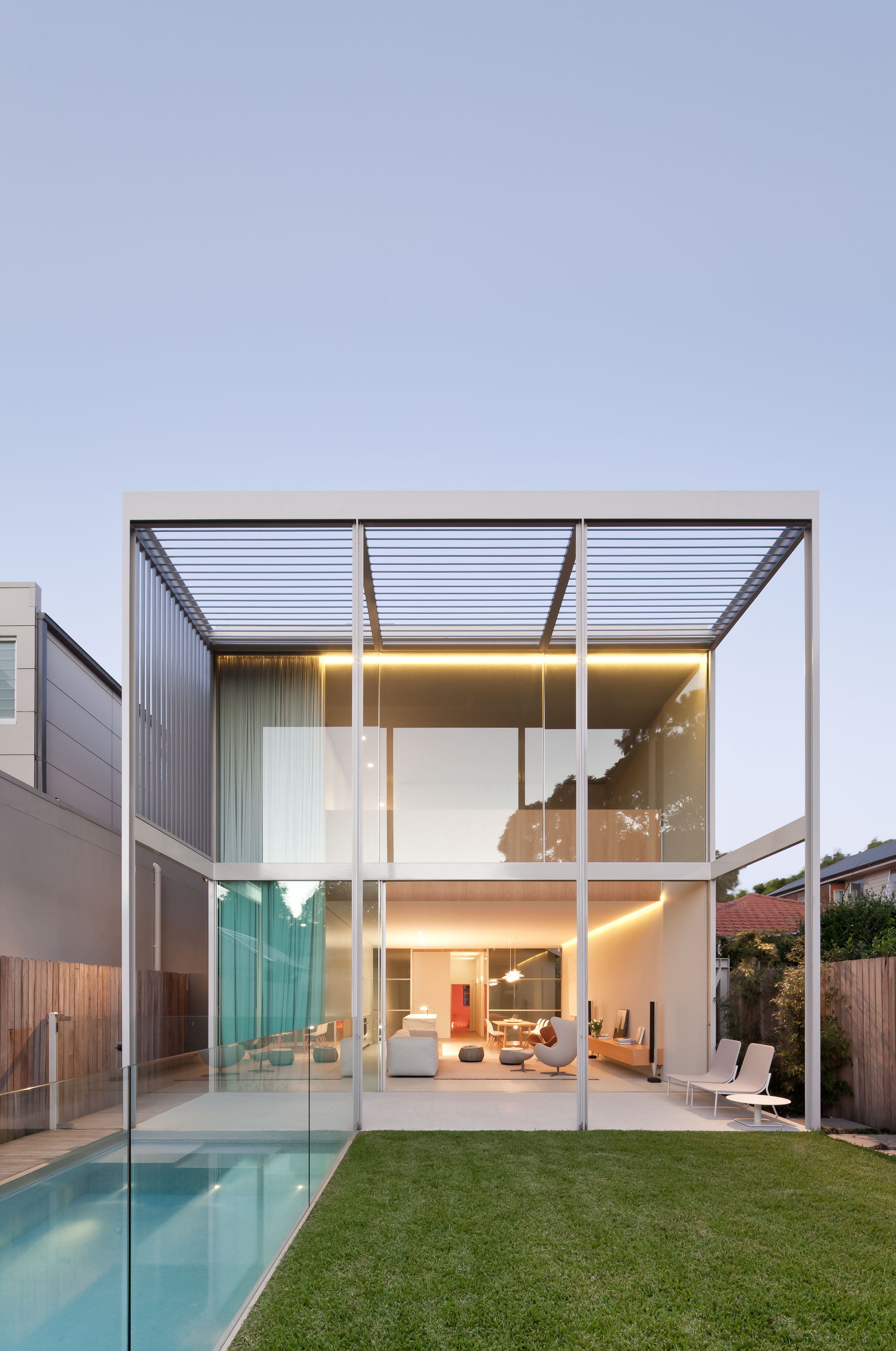 “East and west enclosing walls to the two-storey rear addition are fully glazed to maximise natural light and cross ventilation, and create a direct connection to the rear garden and pool. North and south enclosing walls remain solid for privacy to neighbouring properties, and taper on the ends to meet the finely detailed glazing system.”