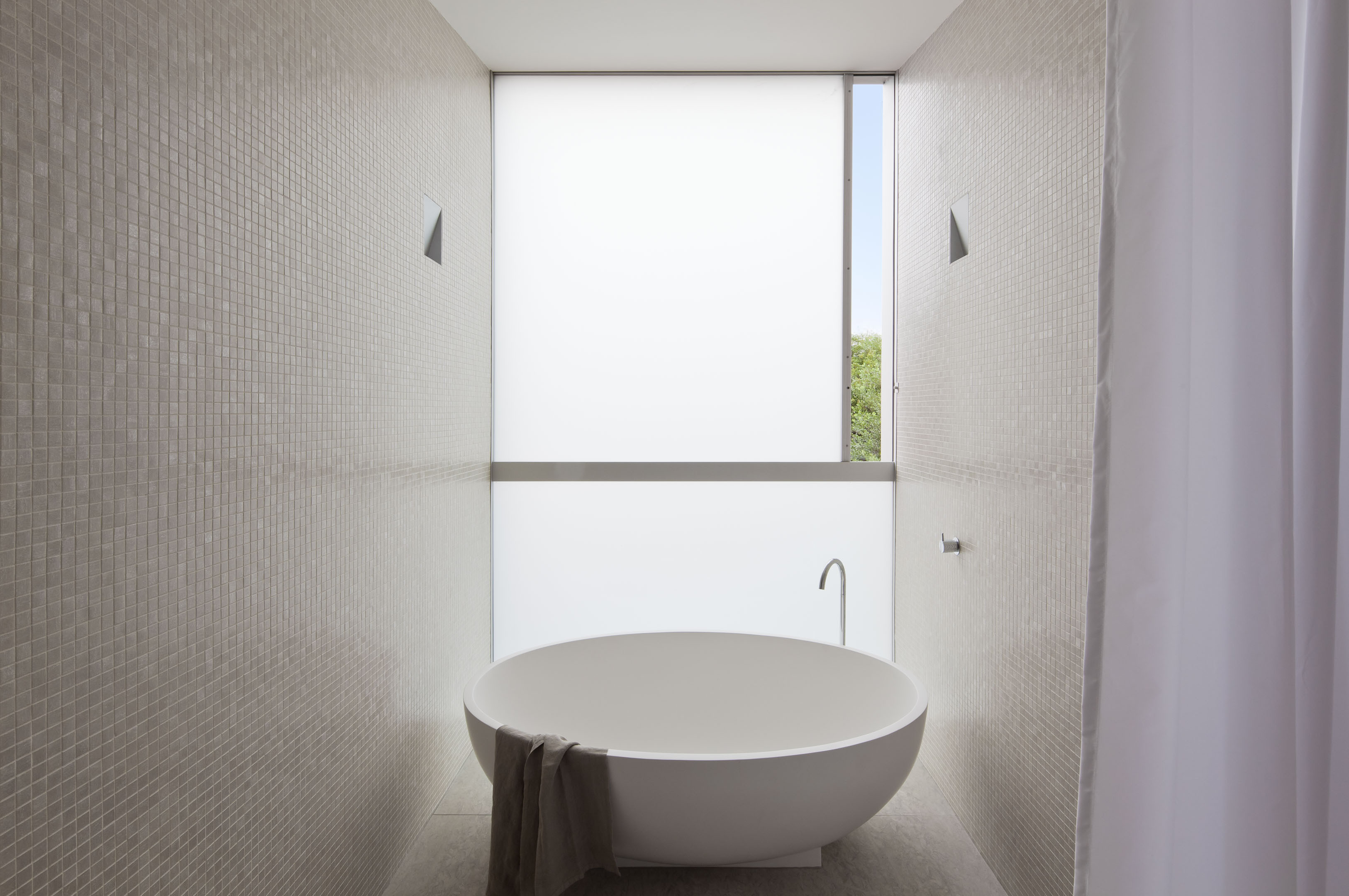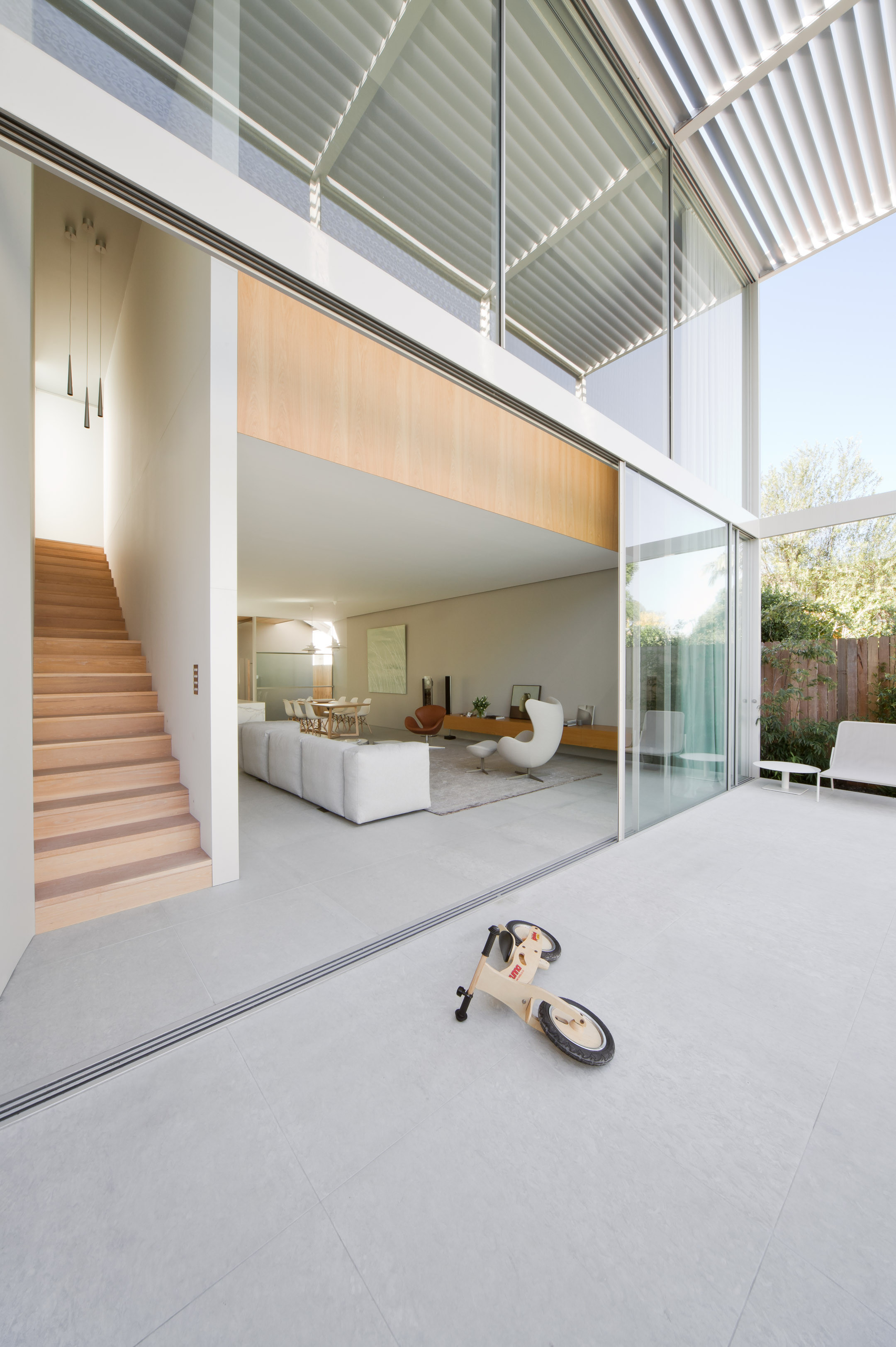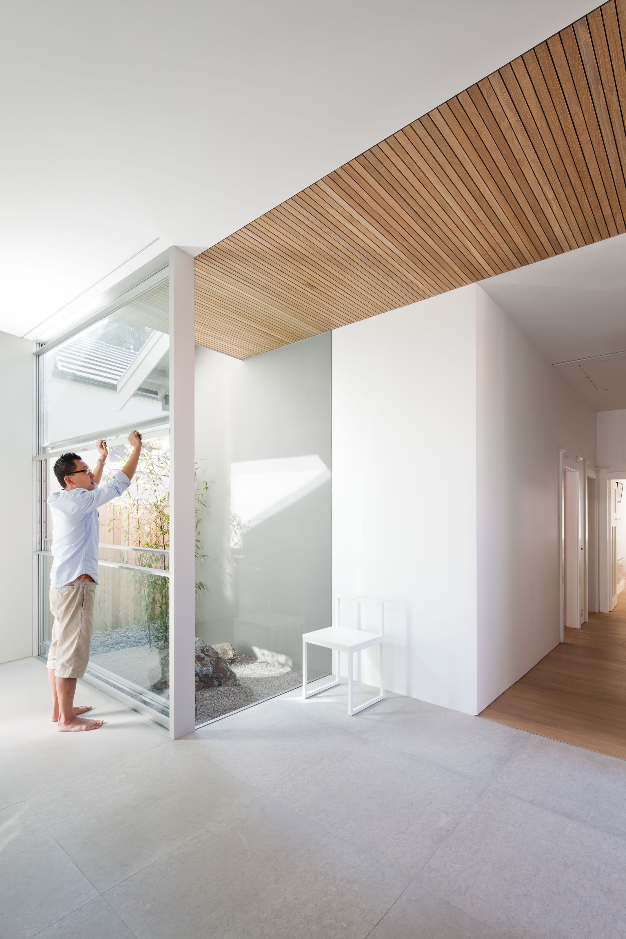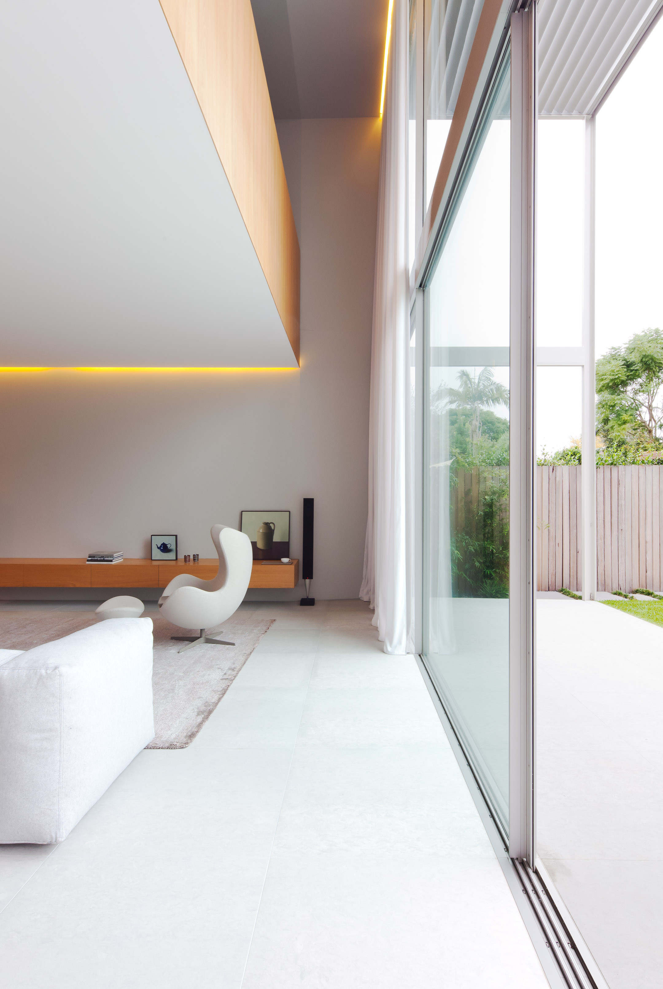 “East and west enclosing walls to the two-storey rear addition are fully glazed to maximise natural light and cross ventilation, and create a direct connection to the rear garden and pool. North and south enclosing walls remain solid for privacy to neighbouring properties, and taper on the ends to meet the finely detailed glazing system.”