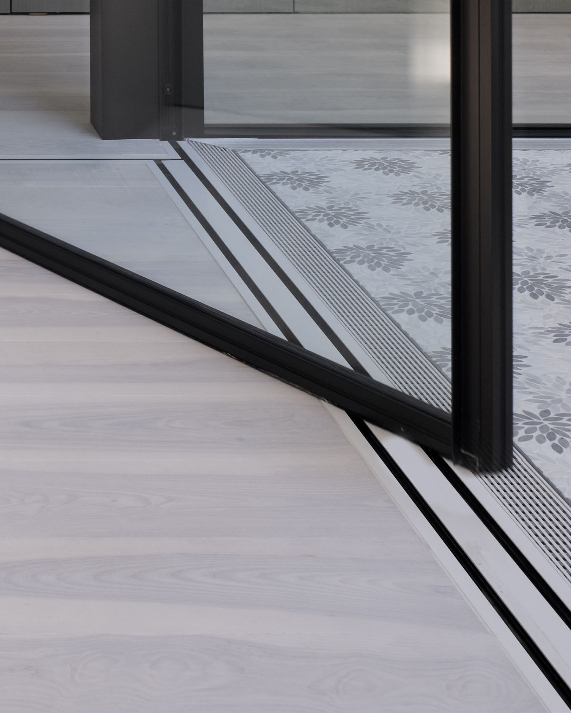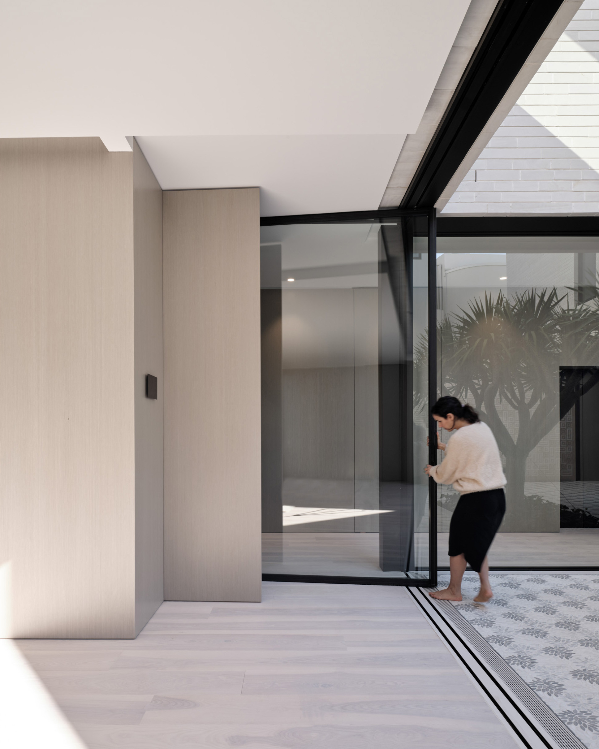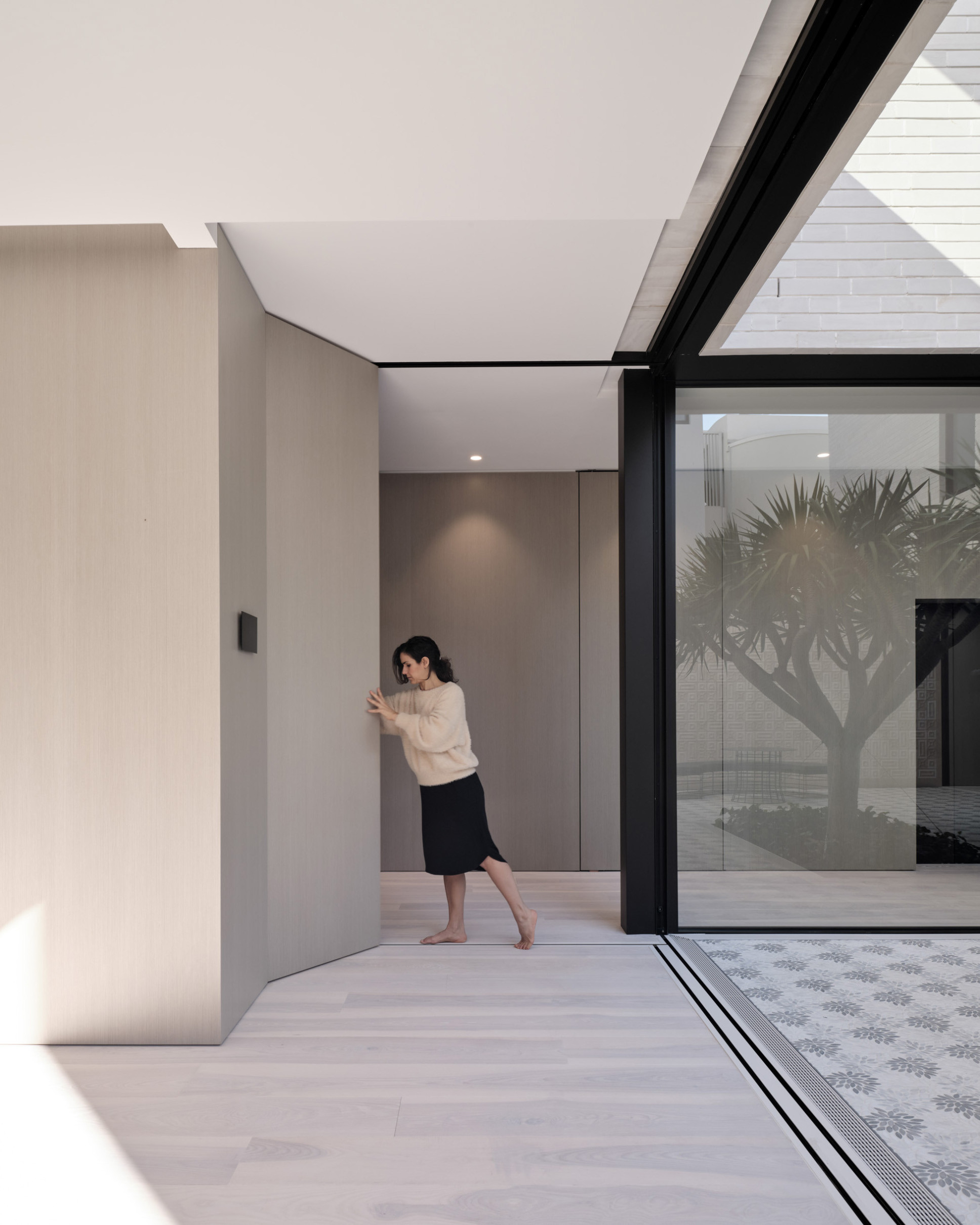 Glass panels pivot around corners and glide through the space, to completely disappear from view.